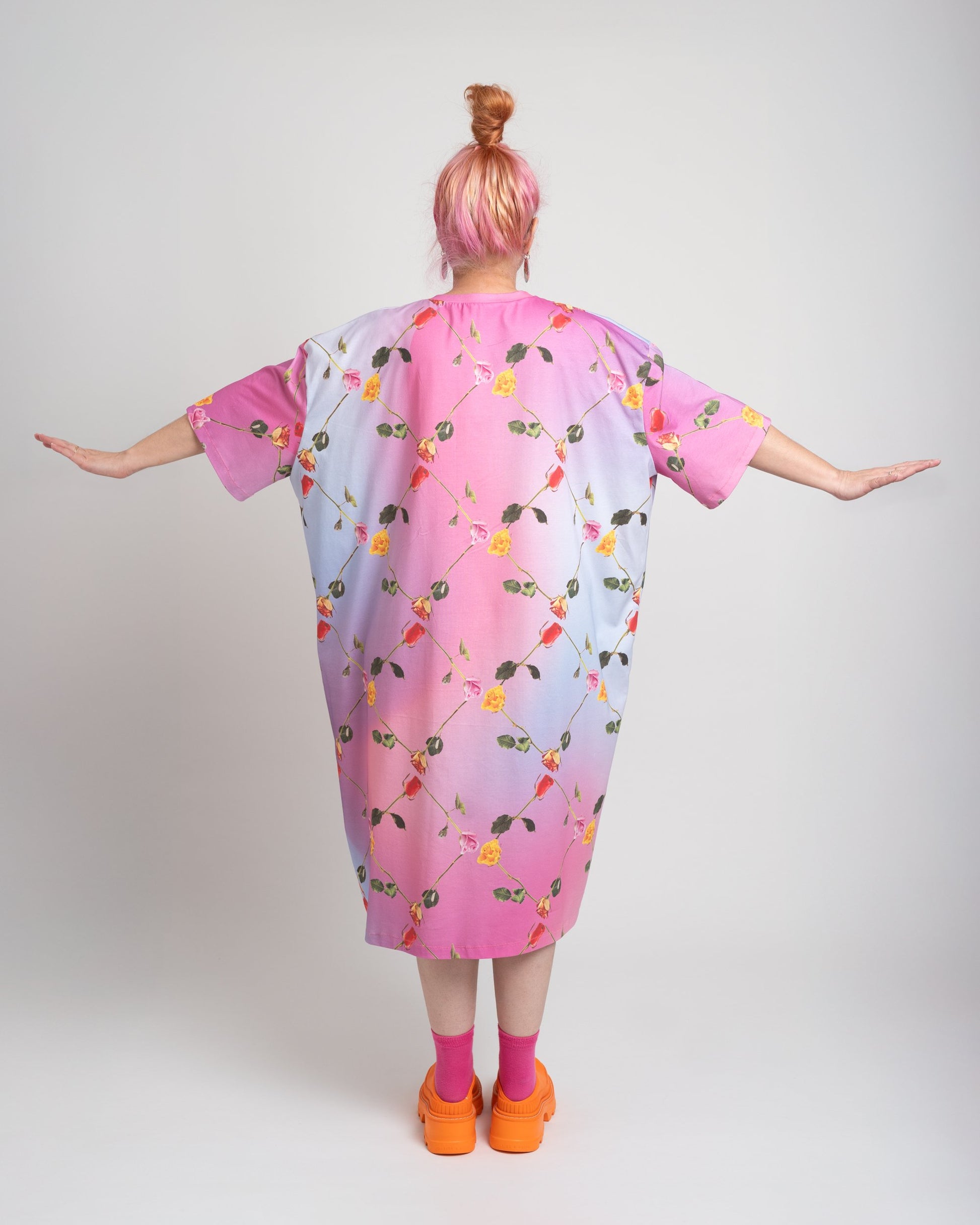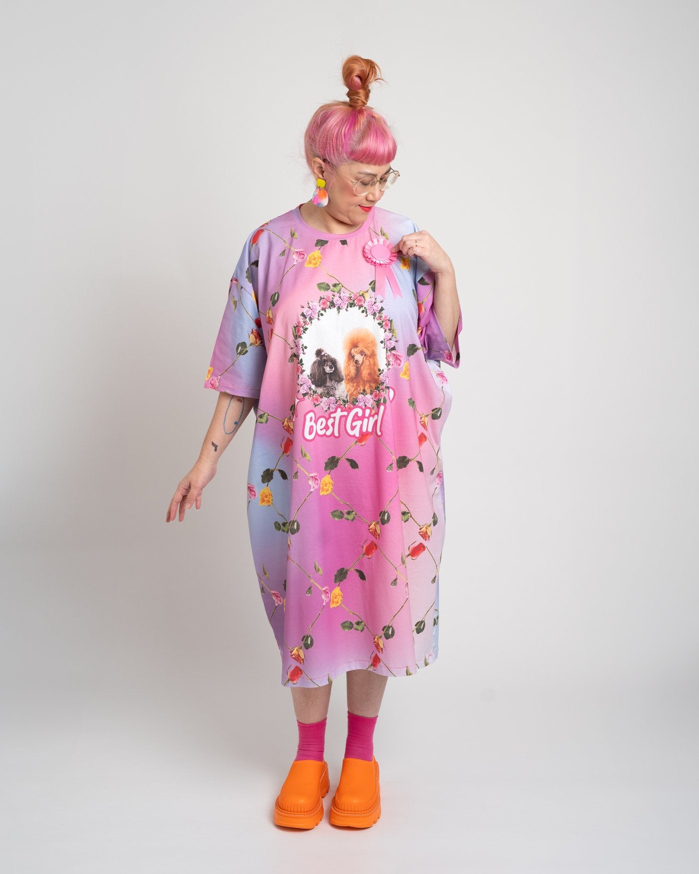 A dress for the girls, the giggles and our goofy dog friends. The Best Girl Dress is a joyful ode to friendship - the bestie kind. Featuring a custom print of two funny pups striking their sassiest poses amongst a decorative rose print. Inspired by best in show, loyal friendships and tapping into that slumber party energy.